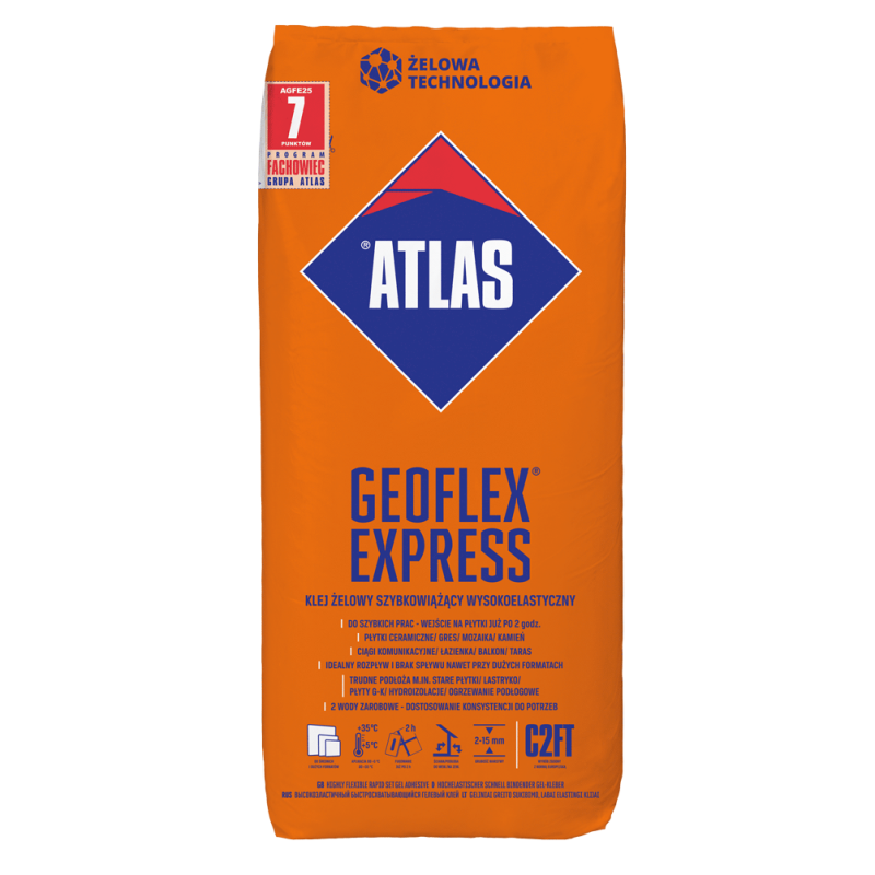 ATLAS GEOFLEX EXPRESS je vyrábaný v podobe suchej zmesi z najkvalitnejšieho cementového spojiva, drte a špeciálne vybraných modifikačných prostriedkov: prírodných i syntetických. Vďaka rýchlo tuhnúcemu cementu použitému v lepidle, ktorý umožňuje získať veľmi rýchlu prídržnosť a pevnosť ide práca s lepidlom veľmi rýchlo, predovšetkým v počiatočnej dobe (prvé 2-3 hodiny po prilepení obkladových prvkov). Lepidlo sa okrem iného odporúča na rýchle opravy podláh (napr. na balkónoch, terasách, a pod.)