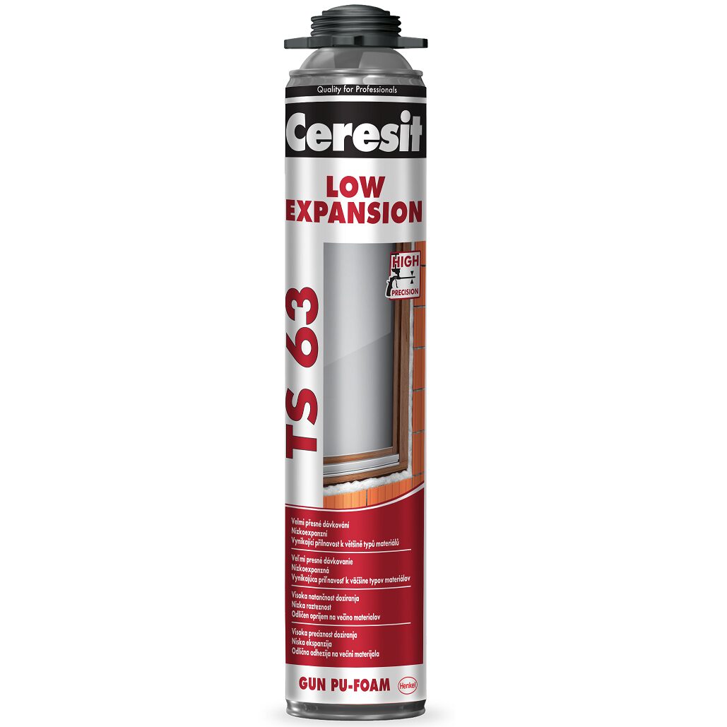 Ceresit TS 63 je jednozložková nízkoexpanzná pištoľová polyuretánovápena vytvrdzujúca vzdušnou vlhkosťou vhodná pre montáž zárubní, parapetov,prahov, okenných a dverných rámov, vyplňovanie dutín, utesňovanie otvorov vostrešných konštrukciách a izolačných materiáloch, vytváranie zvukotesnýchstien, vyplňovanie medzier okolo potrubia, fixácia a izolovanie stenových panelov,strešných škridiel, atď.