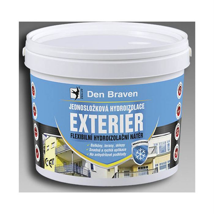 Den Braven Jednozložková hydroizolácia exteriér 13kg je jednozložková hydroizolácia exteriér 13kg je určená pod keramické obklady, dlažby v interiéroch aj exteiréroch budov so zvýšenou vlhkosťou (balkóny, terasy, lodžie, umývačky áut, pivnice, práčovne, kuchyne a pod. Po zaschnutí vytvorí elastický, tesný a vodeodolný náter.