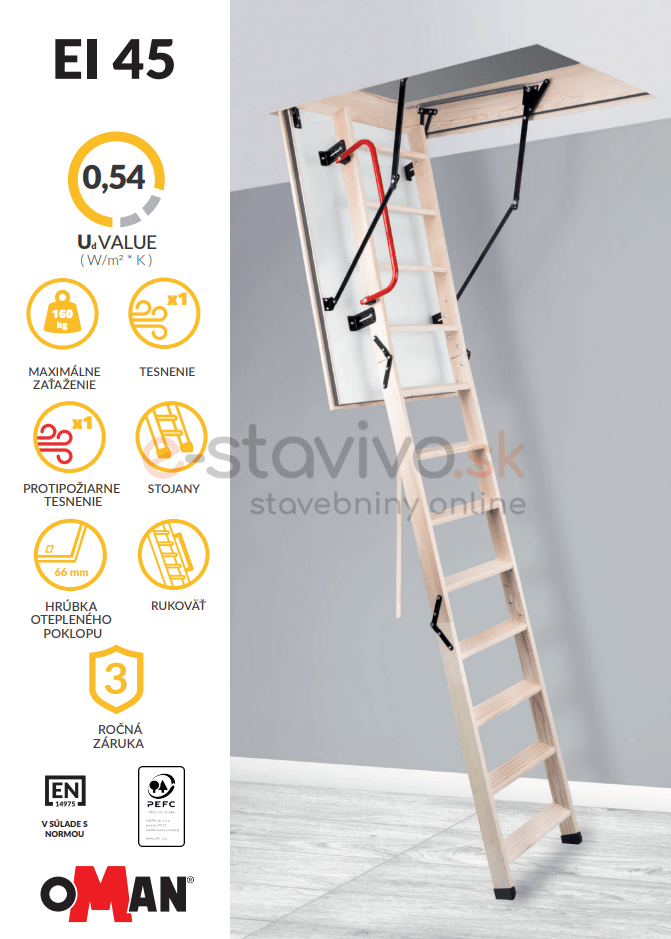 Schody sú vyrobené pre maximálnu výšku podlahy 280 cm a majú špeciálny drevený rám vysoký 170 mm. Obsahujú 3-dielny drevený rebrík so stupňami s protišmykovou úpravou. Jednotlivé časti rebríka sú spojené špeciálnou oceľovou sponou, čo zaručuje veľmi pevné spojenie. Maximálne možné zaťaženie podkrovného rebríka EI45 je 160 kg.