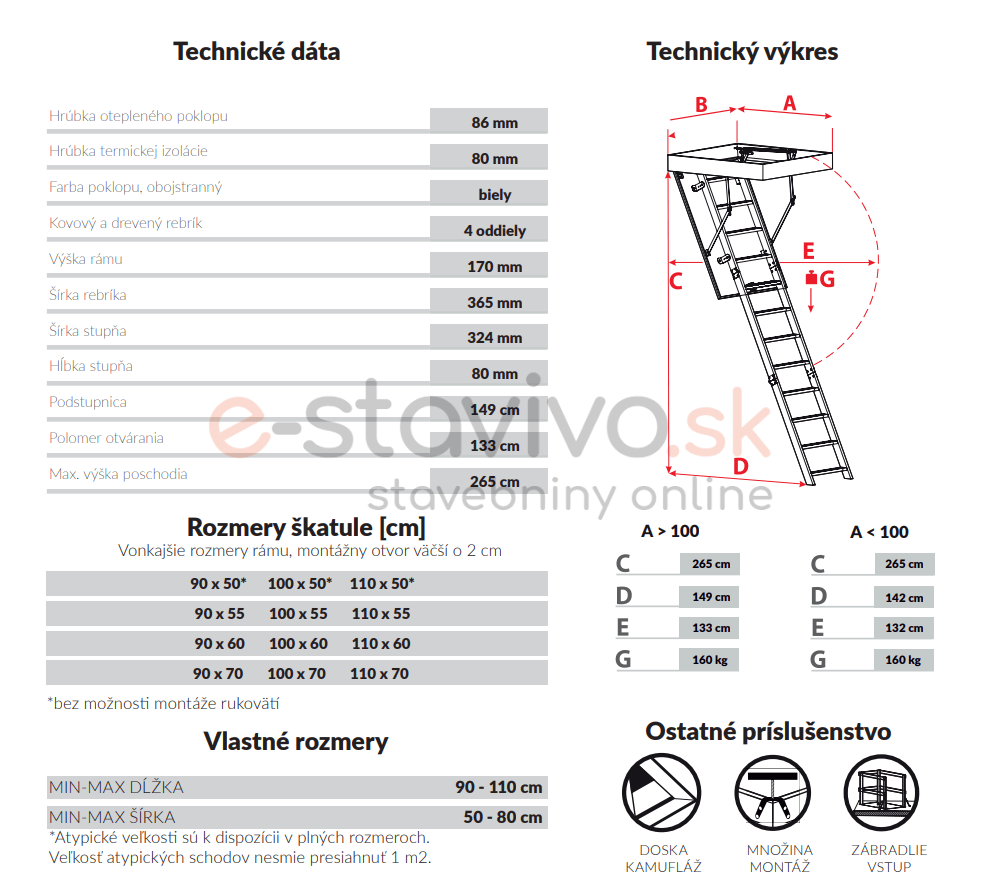 Súčasťou balenia je vyťahovacia tyč, zábradlie, sada pružín na jednoduché otváranie a zatváranie schodov a zatvárací mechanizmus (zámok) – schody tak možno jednoducho rozbaliť a namontovať.