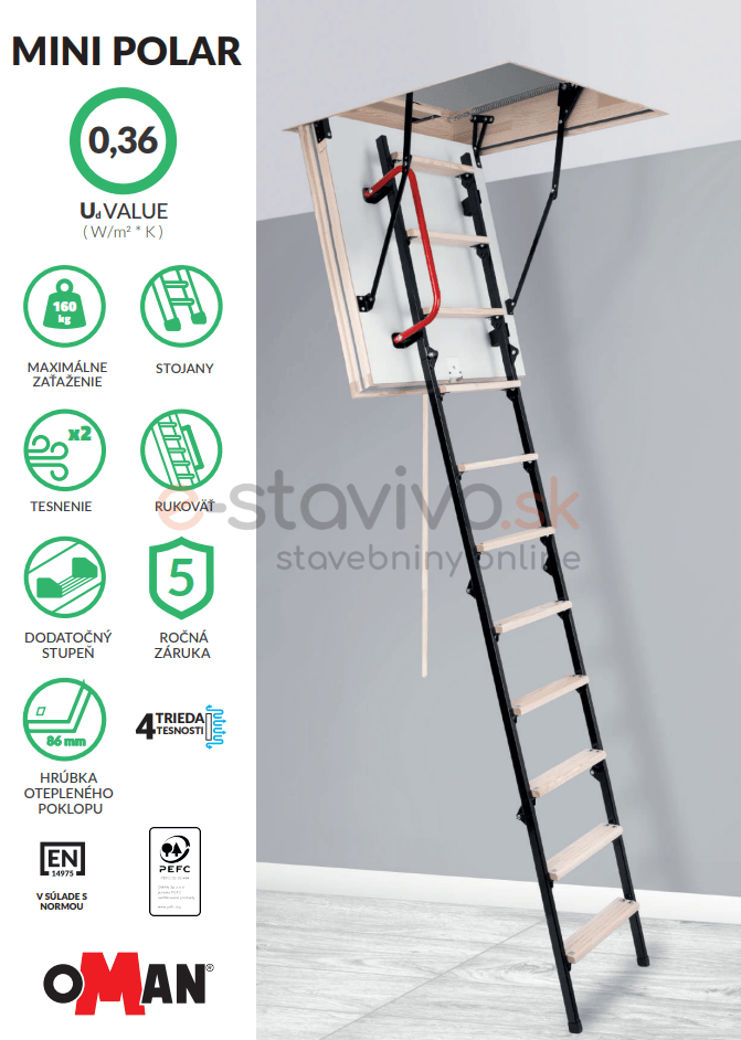 Pôdne schody Oman Mini Polar sú ideálnym riešením pre prístup do podkrovia v priestoroch s nedostatkom miesta a s dokonalými izolačnými vlastnosťami. Tieto sklápacie schody do podkrovia slúžia ako jednoduchý, praktický a izolovaný prístup do podkrovia.