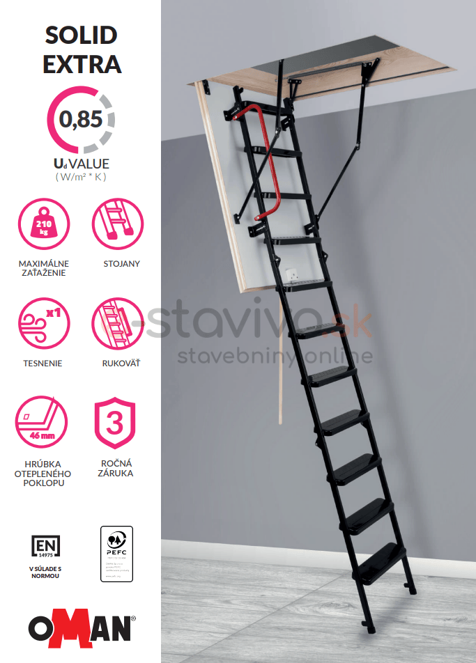 Podkrovné schody Oman Solid Extra sa dodávajú s príslušenstvom za výhodnú cenu. Tieto sklápacie podkrovné schody slúžia ako jednoduchý, praktický a izolovaný prístup do podkrovných priestorov.