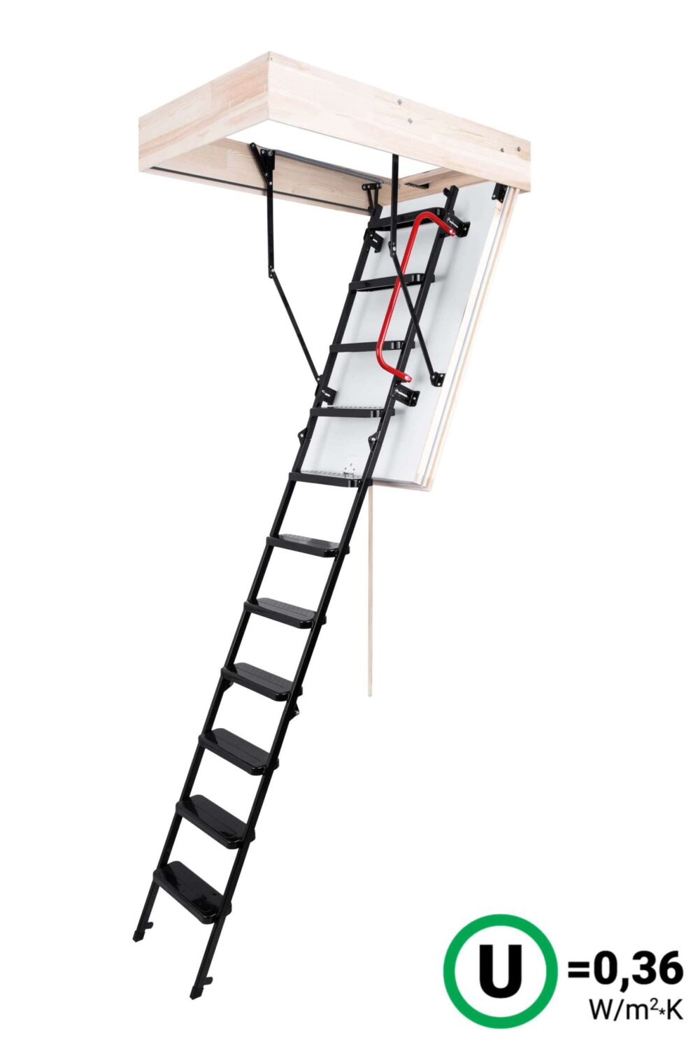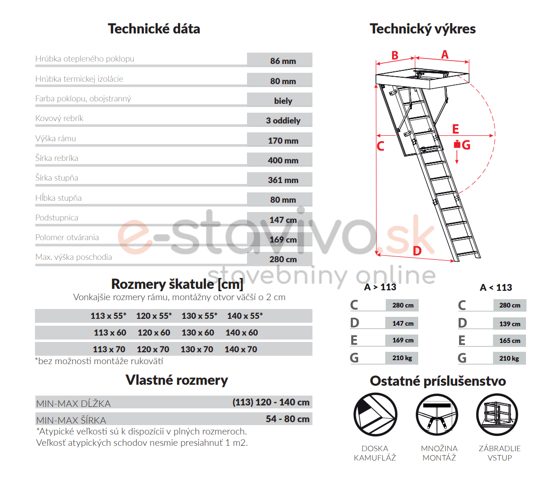 Schody sú vyrobené pre maximálnu výšku podlahy 280 cm a majú drevený rám vysoký 170 mm. Schody majú 3-dielny kovový rebrík na lezenie, stupne s protišmykovou úpravou a práškovou povrchovou úpravou. Jednotlivé časti rebríka sú spojené špeciálnou oceľovou sponou.