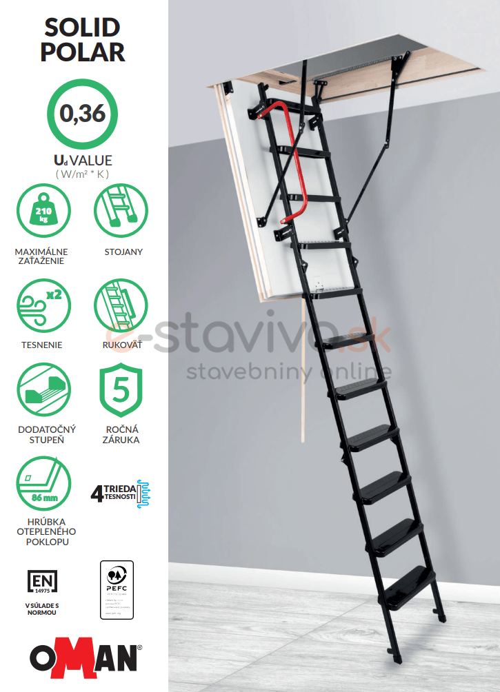 Podkrovné schody Oman Solid Polar sú najlepším modelom v triede schodov Solid. Schody sú určené pre nízkoenergetické domy a všade tam, kde je potrebná dokonalá izolácia. Tieto skladacie podkrovné schody slúžia ako jednoduchý, praktický a izolovaný prístup do podkrovných priestorov.